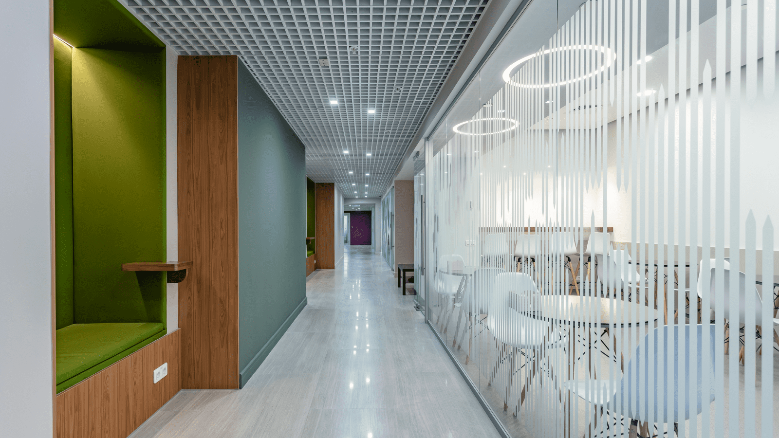 - Свет. Грамотное сочетание естественного и искусственного освещения. «Умные» системы автоматически регулируют свет в зависимости от времени дня и занятости зон.
